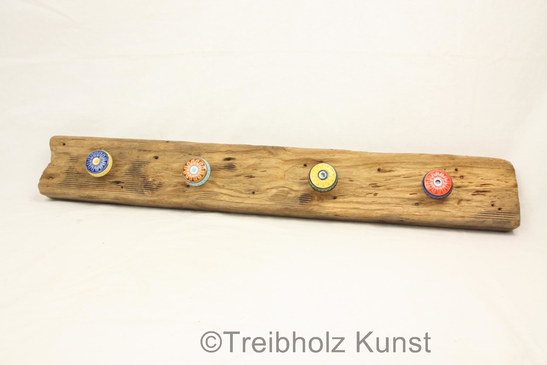 einem Treibholzbrett und fünf farbige Haken aus Porzelan.